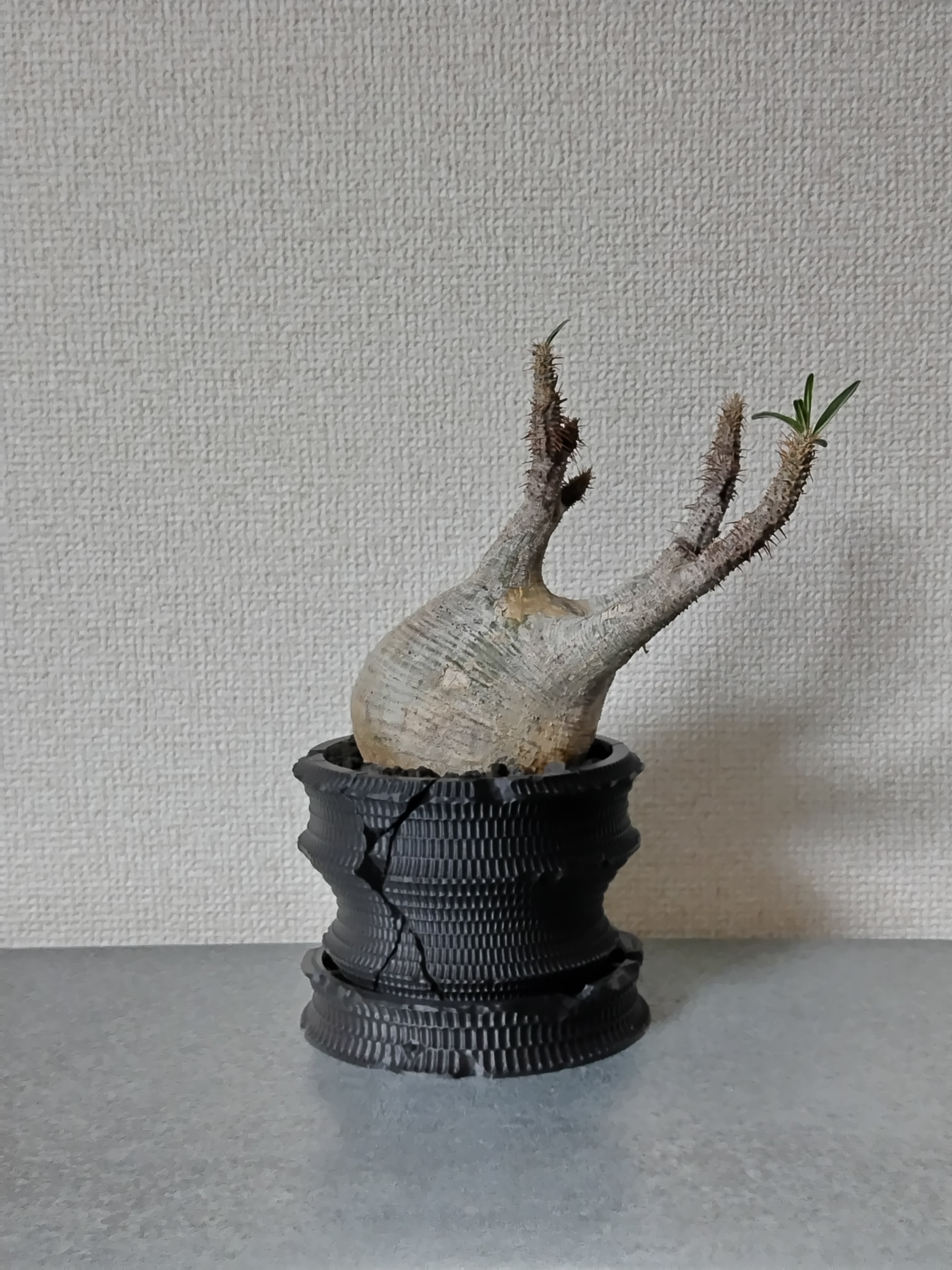 欠損と亀裂を帯びた鎬模様が特徴。ジャイロイド(3次元メッシュ)によって形成された亀裂と大きめの底穴によって強度、通気性、排水性を追求しました。同シリーズの『DC-HKR-A』、『DC-HKR-B』の中間的な形状で塊根植物やアガベに加えて幅広い植物と相性の良い鉢です。