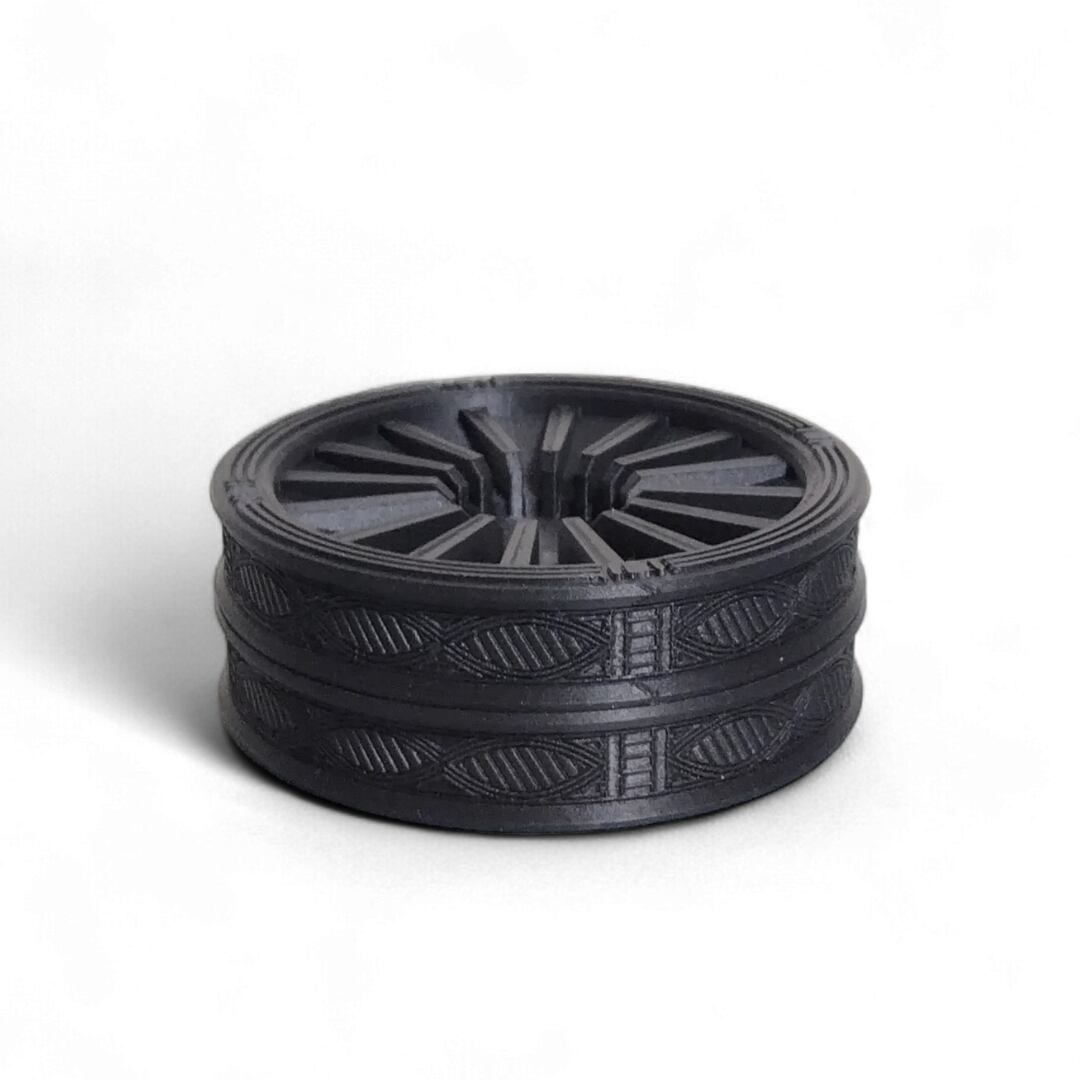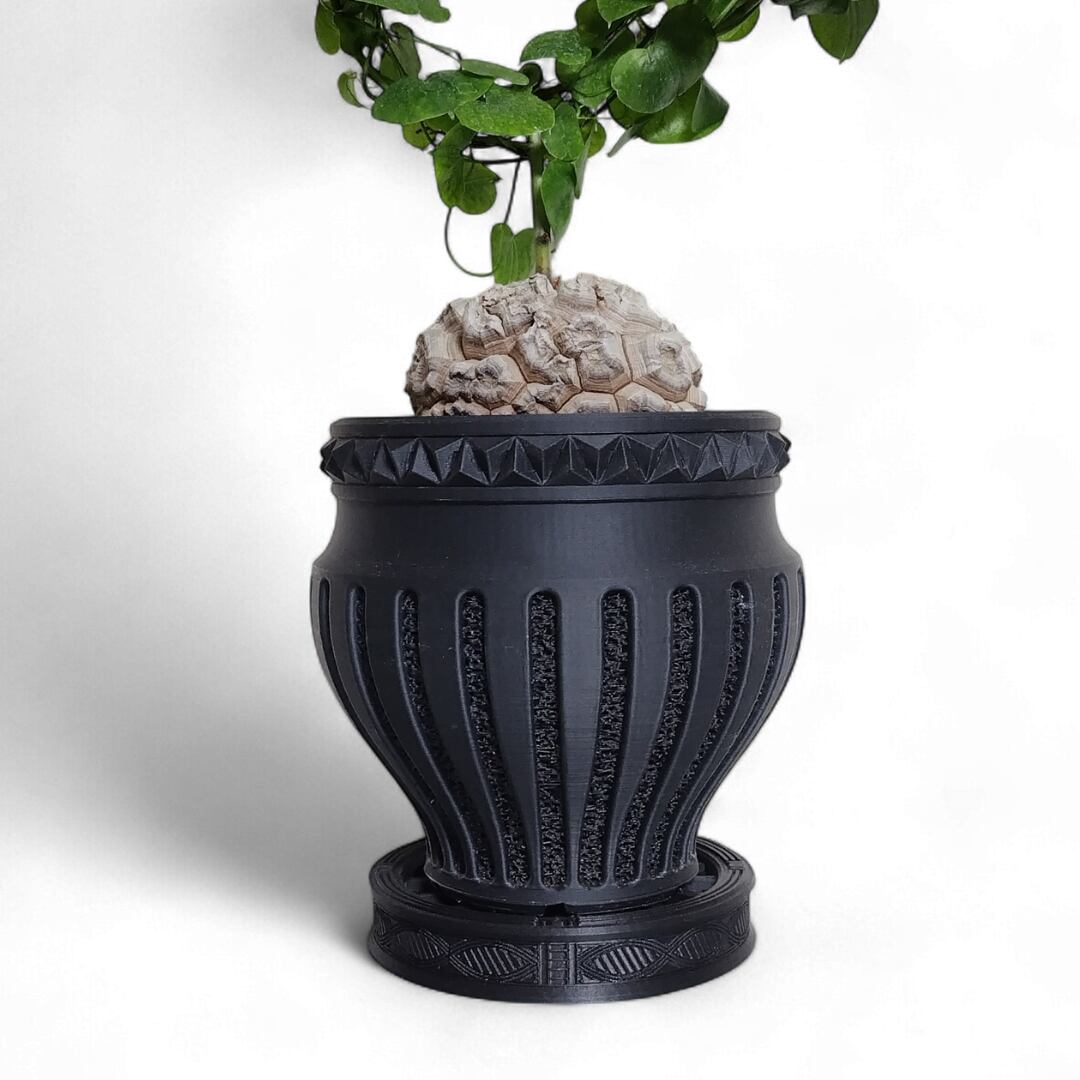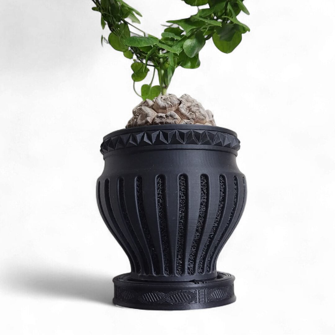 そうした文様の佇まいを大切にし、植物を支えるための形として受皿に取り入れました。繰り返される線のリズムと深く沈んだ黒が、植物の佇まいに落ち着きと静かな存在感を添えます。身につけるための美しさを暮らしの風景の中へ。植物とともに文化の気配をそっと感じられる受皿です。