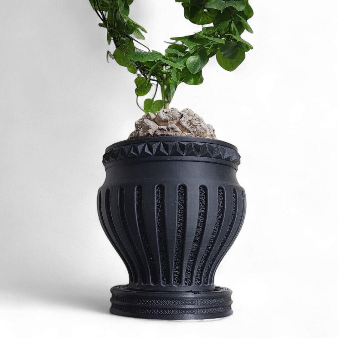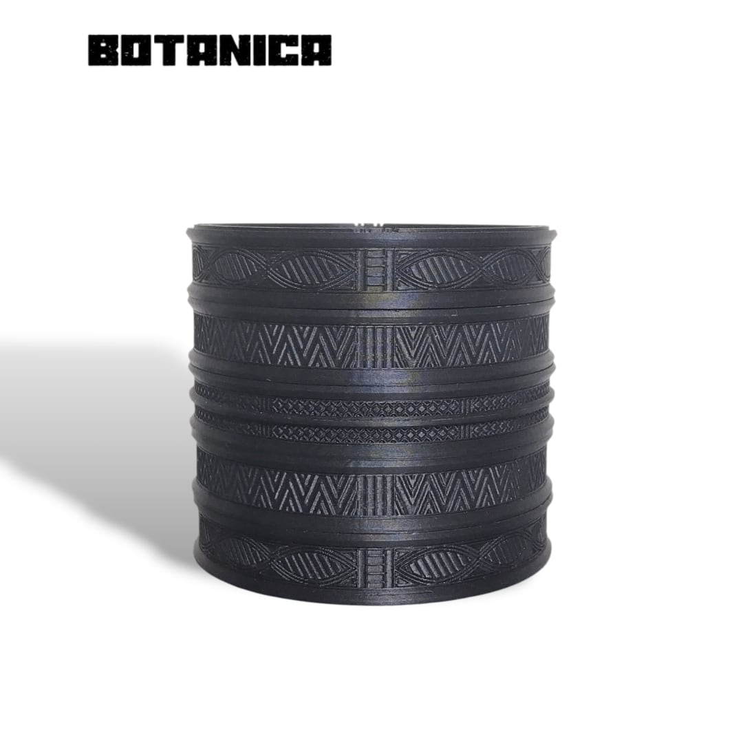 そうした文様の佇まいを大切にし、植物を支えるための形として受皿に取り入れました。繰り返される線のリズムと深く沈んだ黒が、植物の佇まいに落ち着きと静かな存在感を添えます。身につけるための美しさを暮らしの風景の中へ。植物とともに文化の気配をそっと感じられる受皿です。